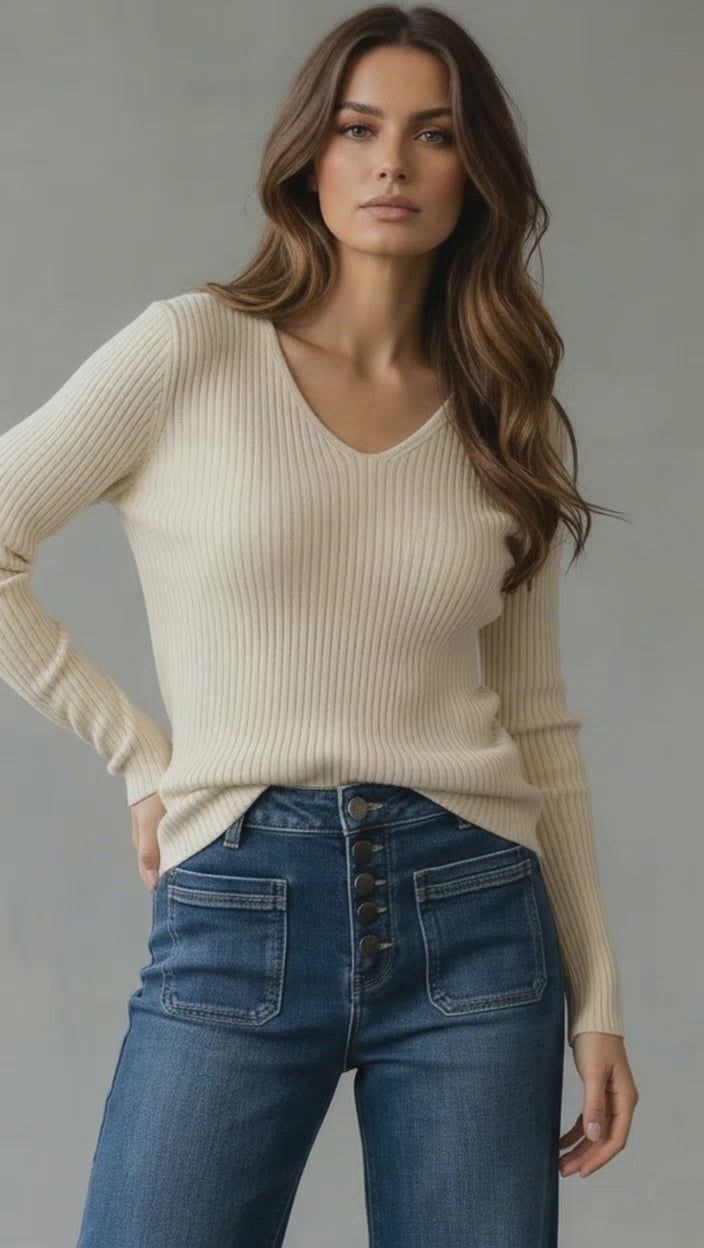 Tento jemne pletený top s výstrihom do V je perfektnou voľbou, ak máte radi kúsky, ktoré sú zároveň elegantné a pohodlné.